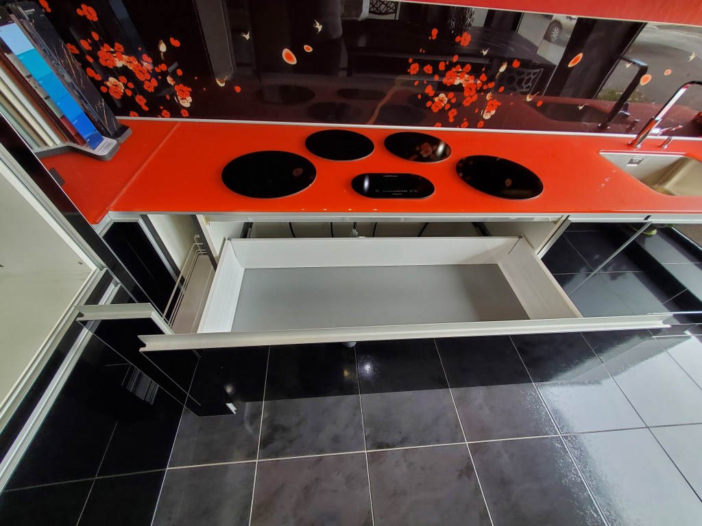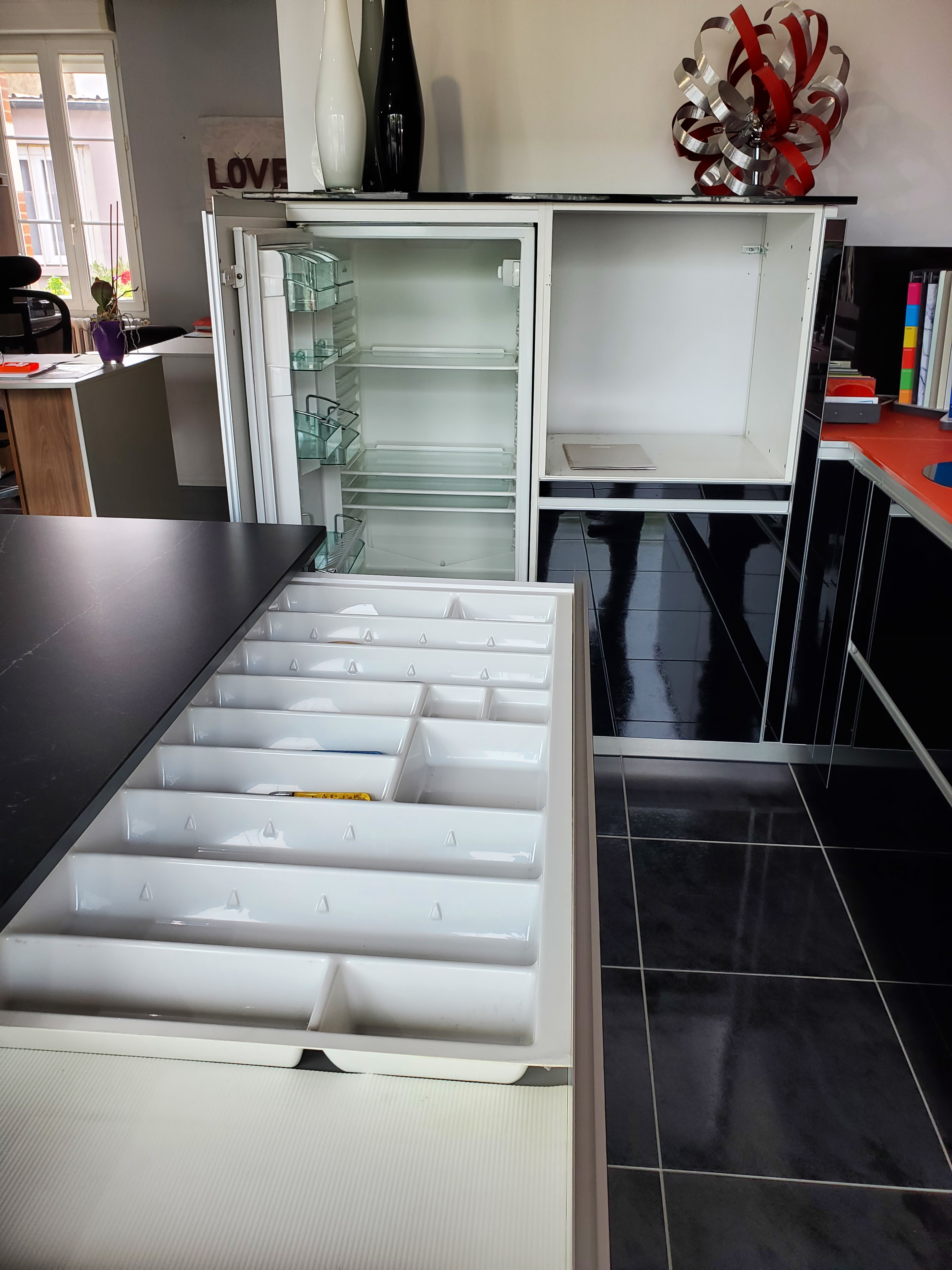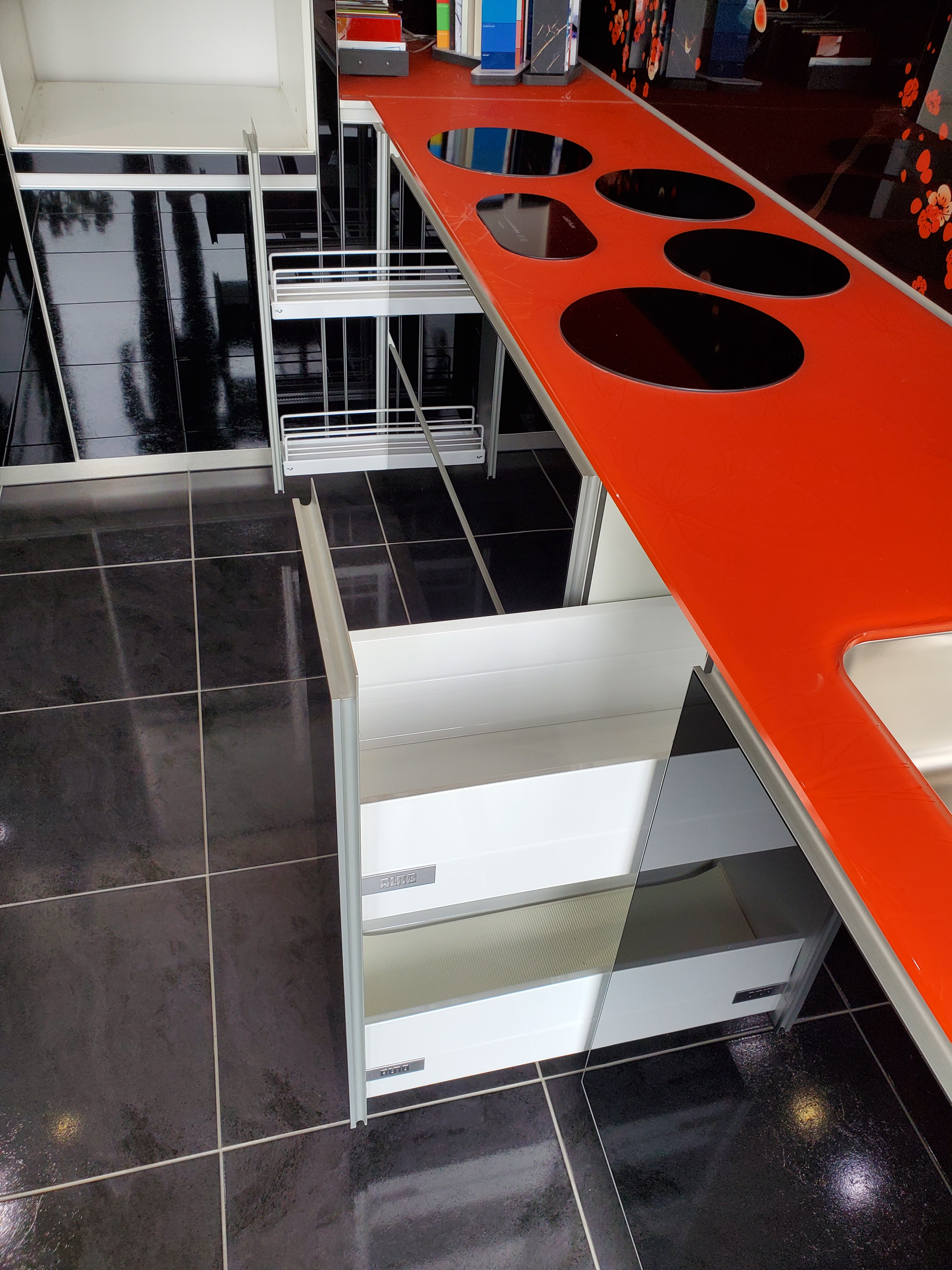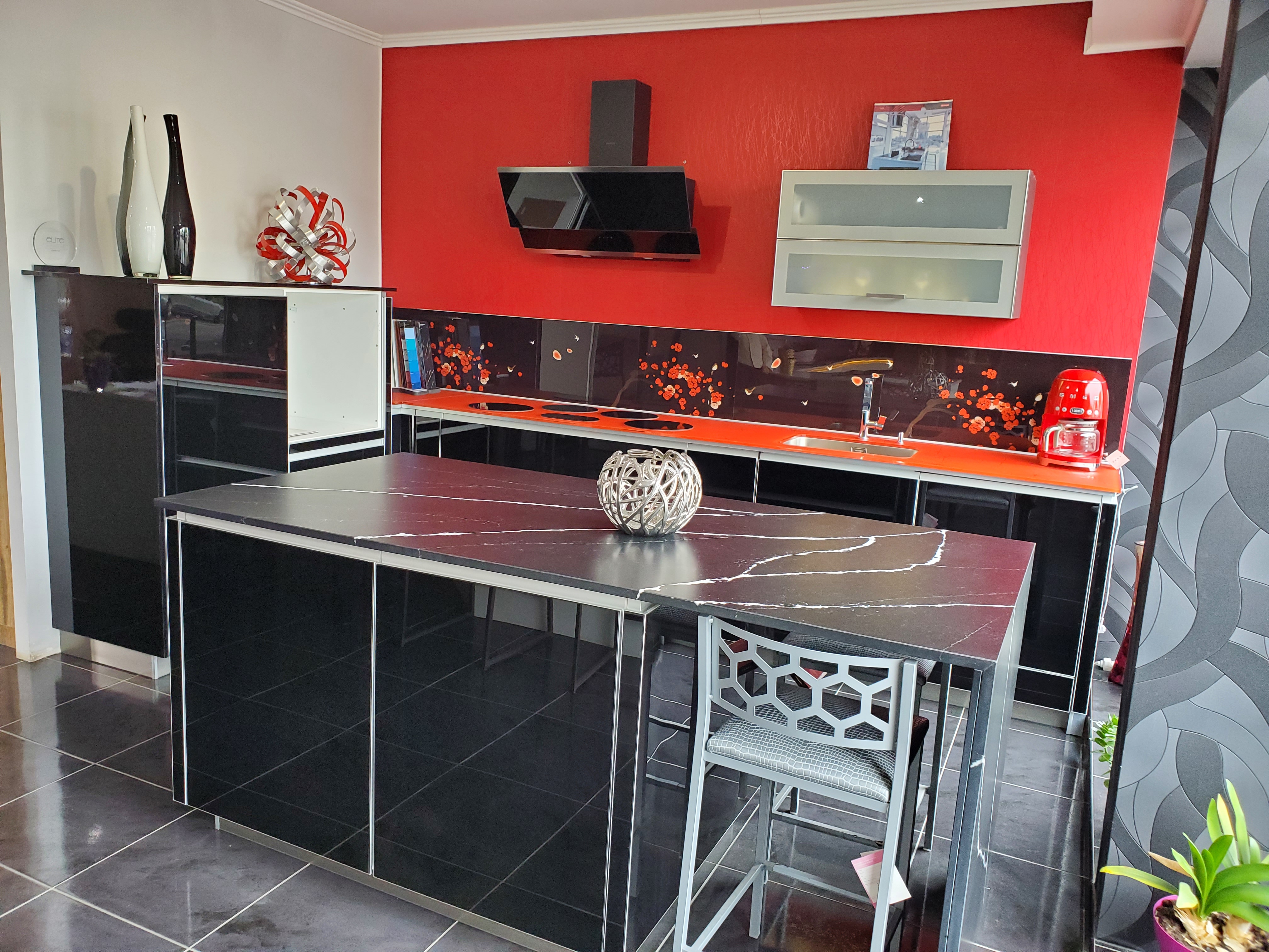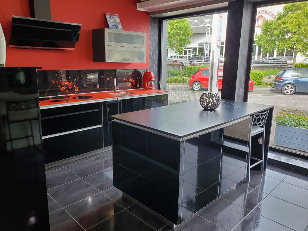 Cuisine Alno (haut de gamme), façade en verre noir sécurisé avec quatre chants protecteur en aluminium massif.